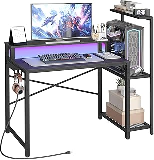 Lufeiya Black Gaming Desk with LED Lights and Power Outlets, 40 Inch Teen Writing Study Table Home Office Desks with Monitor Stand, Computer Desk with Charging Station USB Port, Black
